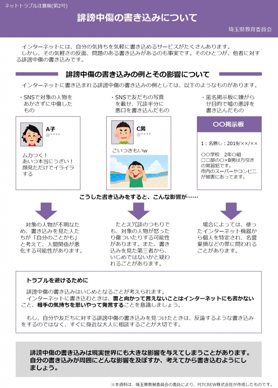 埼玉県教育委員会より、ネットトラブル注意報第2号が届きました。
