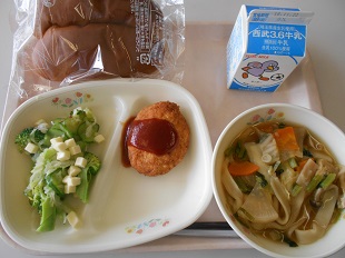 今日の給食は、黒パン、牛乳、煮ぼうとう、ゼリーフライ、チーズサラダです。