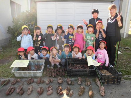 「ウントコショ、ドッコイショ!」・・・『大きなかぶ』の絵本に出てくるかけ声を、みんなで声を合わせてかけながら、大きなサツマイモを掘り出します絵文字:笑顔