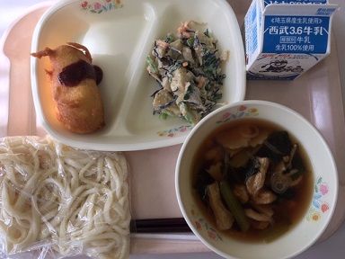 今日の給食は、五目うどん、牛乳、アメリカンドッグ、彩の国サラダ です。
