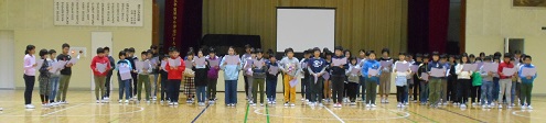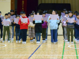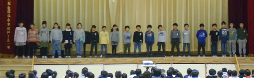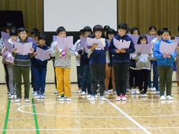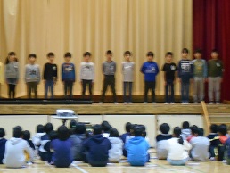 初めに、12月8日(日)に深谷市民文化会館で行う『こども学びスタ in 深谷』に出場する3年生が今年度、暗唱チャレンジで覚えた『雨にも負けず』と『夢七訓』を披露してくれました。
