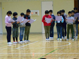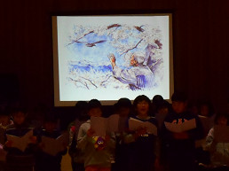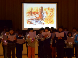 続いて、5年生が国語の時間に学習している『大造じいさんとガン』の朗読を全員で披露してくれました。