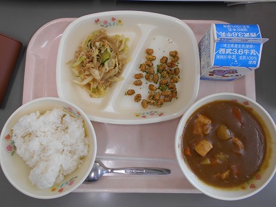 今日の給食は、カレーライス、大豆のカリカリ揚げ、ヘルシーサラダ、牛乳です。