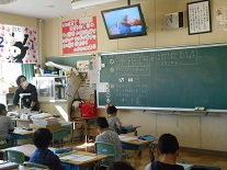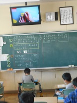 また、2年生の教室では、分数の勉強をしていました。分数を色紙を折って体験しながら、書画カメラ・テレビを使って学習していました。2年生も集中していました。