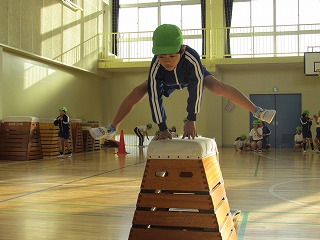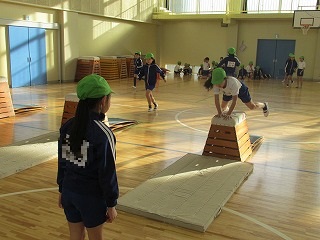 体育で跳び箱を行いました。安全のために、着地をピタッと止める事を意識して跳びました。