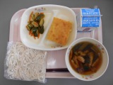 今日の給食は、五目うどん、牛乳、オレンジパンケーキ、ペッパーきゅうりです。
