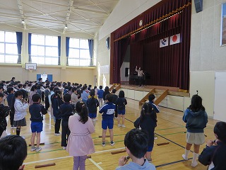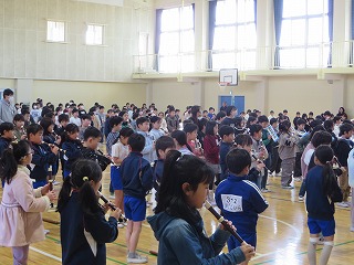 今日の音楽朝会は「ミッキーマウスマーチ」を全校児童で合奏しました。低学年は鍵盤ハーモニカ、中学年はリコーダー、高学年はボディパーカッションを担当しました。それぞれのパートがきれいにつながり、素晴らしい演奏でした。