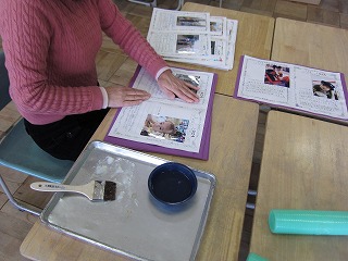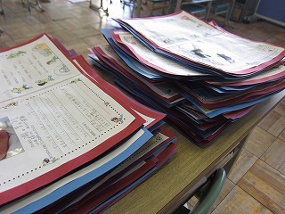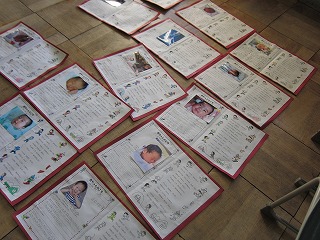 0才のころ、1才のころ‥などのプリントを出してもらいましたよね。それを先生たちで台紙にはりつけています。本当は、みなさんといっしょにやりたかったですが、しかたありませんね。はりながらみんなの小さいころのしゃしんや文を見て、「かわいいー!」「そういう赤ちゃんだったのね」などと、えがおになっています。そして、みなさん一人一人のことを思い出しています★