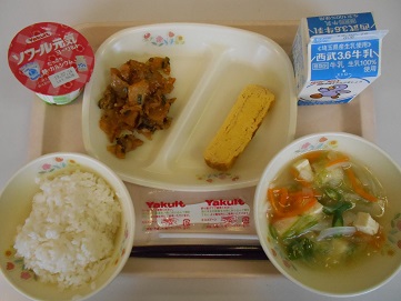 今日の給食は、キムタクのっけご飯、牛乳、厚焼き卵、豆腐とレタスのスープ、ヨーグルト です。