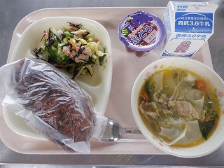 ココア揚げパン・ツナとひじきのサラダ・わんたんスープ・