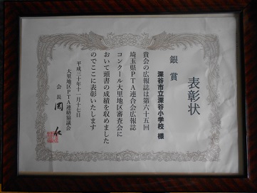 この度、これまでのPTA広報の皆様のご努力のお陰で、見事『銀賞』に輝きました。ありがとうございました。感謝申し上げます。