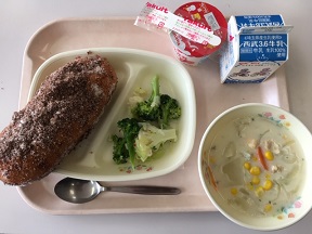 今日の給食は、ココア揚げパン、牛乳、クリームシチュー、花野菜サラダ、ヨーグルト です。