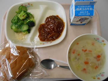 今日の給食は、ハンバーガー、牛乳、温野菜、クラムチャウダー です。