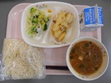 今日の給食は麻婆ラーメン、牛乳、ポテトのチーズ焼き、三色サラダです。
