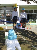 鉄棒で逆上がりを見せてくれる子も、遊具のてっぺんまで登れたことを大きな声で知らせてくれる子、築山の頂上から園庭を見渡している子・・・などなど、晴れ渡った秋空のもとで、思い切り身体を動かす気持ちよさを十分に味わっているようでした絵文字:キラキラ