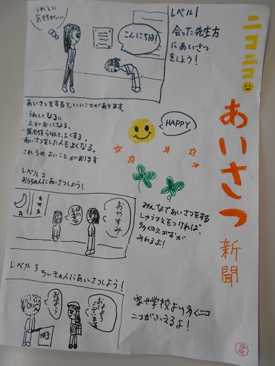 それにしても、自分で『ニコニコ あいさつ新聞』を作ってくれた子がいたということは、うれしくてうれしくて、感激しました。本校児童全員がこんな気持ちになってくれることを期待しています。