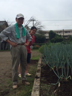 「深小ネギ」の先生 来校 -ねぎの土上げ-3年生が植え付け、6年生も一緒に育てている、深谷小学校農園の