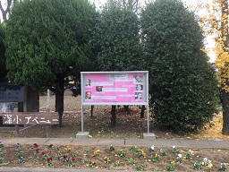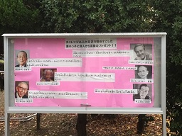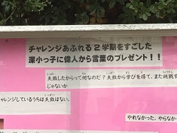 正門近くの掲示版にはってある掲示が新しくなりました。 「チャレンジあふれる2学期を過ごした深小っ子に『偉人から言葉のプレゼント』」が掲示されています。
