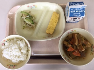 今日の給食は、ごはん、牛乳、大根と豚肉の煮込み、厚焼き玉子、たくあんサラダ です。