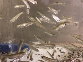 深谷市内の公民館と、小学校や家庭で卵から大切に育てたサケの子どもたち。