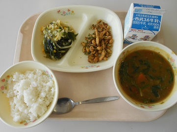 今日の給食は、スピナッチカレー、牛乳、大豆とごぼうのカリカリ揚げ、ジャコ入り海藻サラダ です。