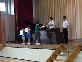 賞状を手に全校児童に向き合った児童たちは、緊張しているようでしたが、やはり誇らしそうな様子もうかがえました。