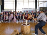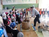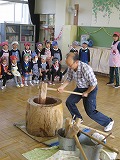 せいろで餅米を蒸かし、お餅つきのお師匠さんの見せてくださったお手本を真似て、子供たちがお餅つき絵文字:笑顔お友達の「ぺったん!ぺったん!」というかけ声に励まされ、頑張って杵を持ち上げ、餅米の上に落とします。それを繰り返しているうちに・・・餅米はだんだんお餅になっていきました絵文字:笑顔