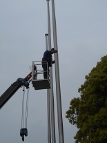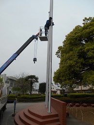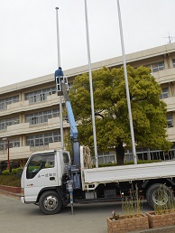 いつも6年生の子供たちが国旗、市旗、校旗を掲揚してくれている掲揚塔を点検していただきました。少し、調整する必要があるため、少しの間、国旗、市旗、校旗を掲揚するのを止めます。