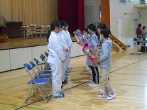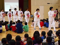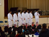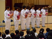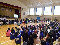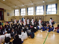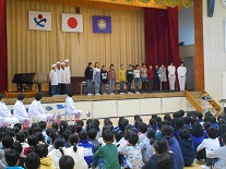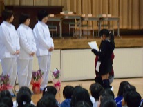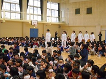 本日の朝、体育館で給食集会を行いました。調理員さんにも参加していただき、子供たちからの感謝の気持ちを花と作文等で表しました。
