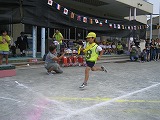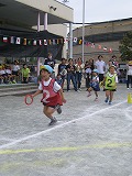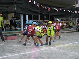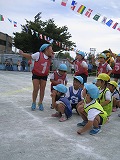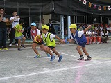 幼稚園の運動会の最終種目は、5歳児・パンダ組の「あお・あか・きいろ チーム対抗リレー」です。「走る」練習を重ね、走ることが楽しくなっている子供たちが、チームでバトン(リング)をつなぐリレーの楽しさ、競い合う面白さに夢中になって取り組みました。