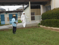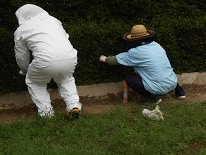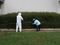 昨日、アシナガバチがたくさん飛んでいたので、写真のように、教頭・用務員の2人で蜂がたくさん飛び、また、止まっていたところに、蜂退治の薬を噴射しました。その後、巣があるのかと何回も見てみましたが、巣は発見できませんでした。ありませんでした。