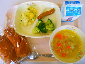 今日の給食は、黒パン、牛乳、焼きフランクとゆでブロッコリー、コルカノン、スコッチブロス です。