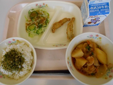 今日の給食は、ごはん、牛乳、煎茶炒り手作りふりかけ、じゃがぶたキムチ、わかさぎフリッター、キャベツときゅうりのドレッシング です。