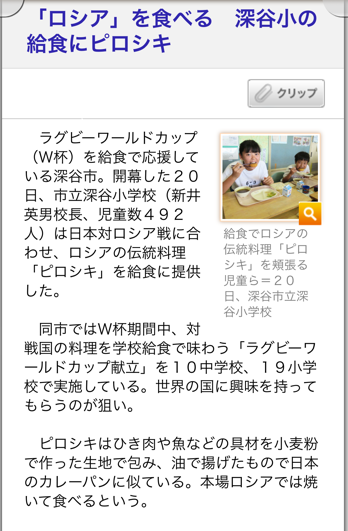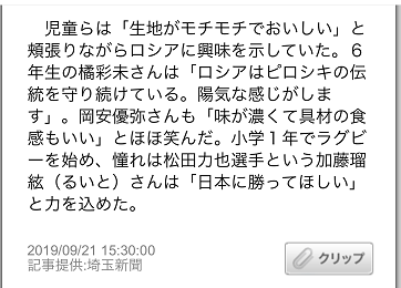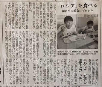9月20日の給食に、ロシアの伝統料理「ピロシキ」を出しました、ラグビーワールドカップで日本と対戦する国を知って、「日本を応援しよう!」と、栄養教諭がいろいろ考えてくれています。この取材に、埼玉新聞の記者の方が訪れてくださいました。その様子が、21日(土)の埼玉新聞に掲載されました。
