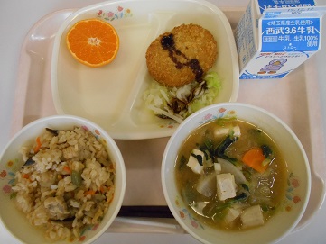 今日の給食は、鳥ごぼうご飯、牛乳、コロッケとゆでキャベツ、花ミカン、味噌汁 です。