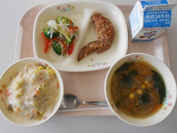 今日の給食は、カレーピラフドリア風、牛乳、フライドチキン、クリスマスサラダ、オニオンスープ です。