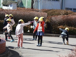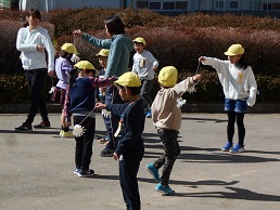 校庭から、とっても楽しそうな声が聞こえてきました。行ってみると、1年生が自分で作ったものが風でくるくる回るのを楽しんでいました。