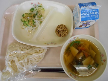 今日の給食は、ソーキそば、牛乳、紅芋ゴマ団子、じゃこと大根のサラダ です。