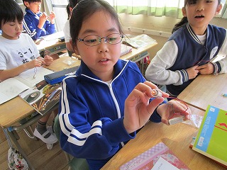 3年生は、理科の「電気の通り道」の授業で豆電球と乾電池をつなげて