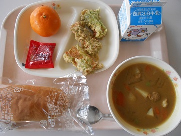 今日の給食は、コッペパン、牛乳、ちくわの磯辺揚げ、カレーシチュー、ぽんかん です。