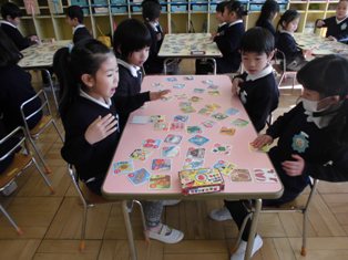 読み札を読む先生の声を真剣に聞き、「はい!」と絵札に手を置く子どもたち。同時になったら、じゃんけんをして取っていましたが、負けた子は悔しそう絵文字:笑顔