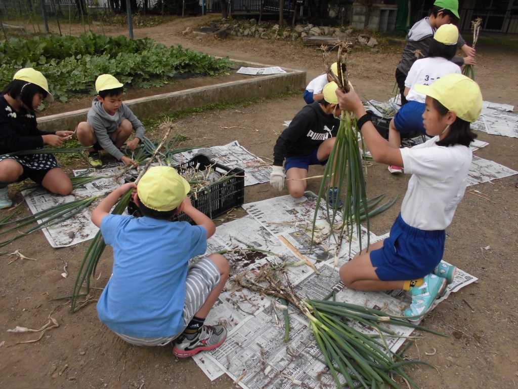 明後日(9日)の産業祭に向けて、今日は3年生が育てたネギたちを抜いて仕分けし、商品にしました。6年生の農業チームが売るときの事を想定して、やさしく新聞紙に包んでいました。ネギの先生のご指導も受けながら、大きく育ったネギを大切に運んでいました。また、ネギのヌルを触って、新鮮さが分かったようです。ひげ根がしっかりついていると、オオ~と歓声をあげていました。