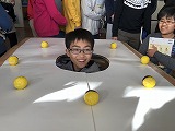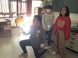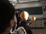 6年生は、理科の学習で月の満ち欠けについて学習をしています。実験をして月の形はどうして変わるのか調べました。月の満ち欠けの理由がわかったので一週間後の形も予想できますね。また、モデルを使って満ち欠けの確認もしました。一人一人が中央の穴に入り、月の形を確認しました。