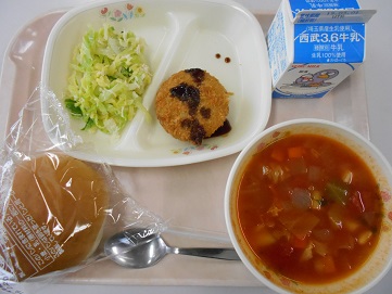 今日の給食は 、コロッケサンド、牛乳、ミネストローネ、ササミとキャベツのサラダ です。