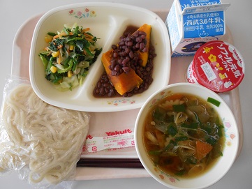 今日の給食は、深谷ネギたっぷりうどん、牛乳、カボチャのいとこ煮、ほうれん草とコーンのソテー、ヨーグルト です。