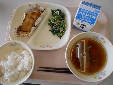 今日の給食は、 ごはん、牛乳、サバのネギ味噌焼き、冬野菜のゴママヨ和え、のっぺい汁 です。