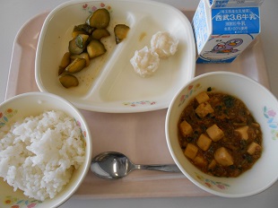 今日の給食は、ごはん、牛乳、マーボー豆腐、えびシュウマイ、きゅうりのピリッと漬け です。