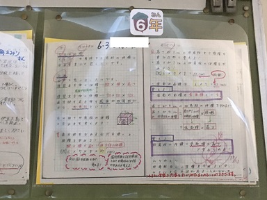 職員室廊下に掲示している自主学習。6年生の掲示が新しくなりました。