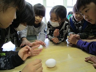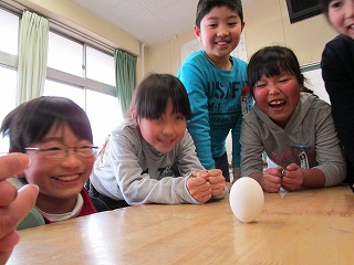 何度も回していたら、教科書に載っているようにたまごが立ちあがって回りました。子どもたちも大興奮でした。