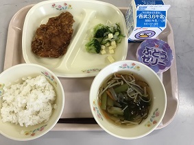 今日の給食は、カツ丼・牛乳・チーズサラダ・もずくのスープ・ぶどうゼリーです。今日は6月の完食キャンペーンで、すべて完食だった6年1組リクエスト献立です。主食・主菜・副菜・汁物のそろったバランスのよい献立ですね。もずくのスープは、今年度のリクエスト献立で2クラスに登場した人気のスープです。